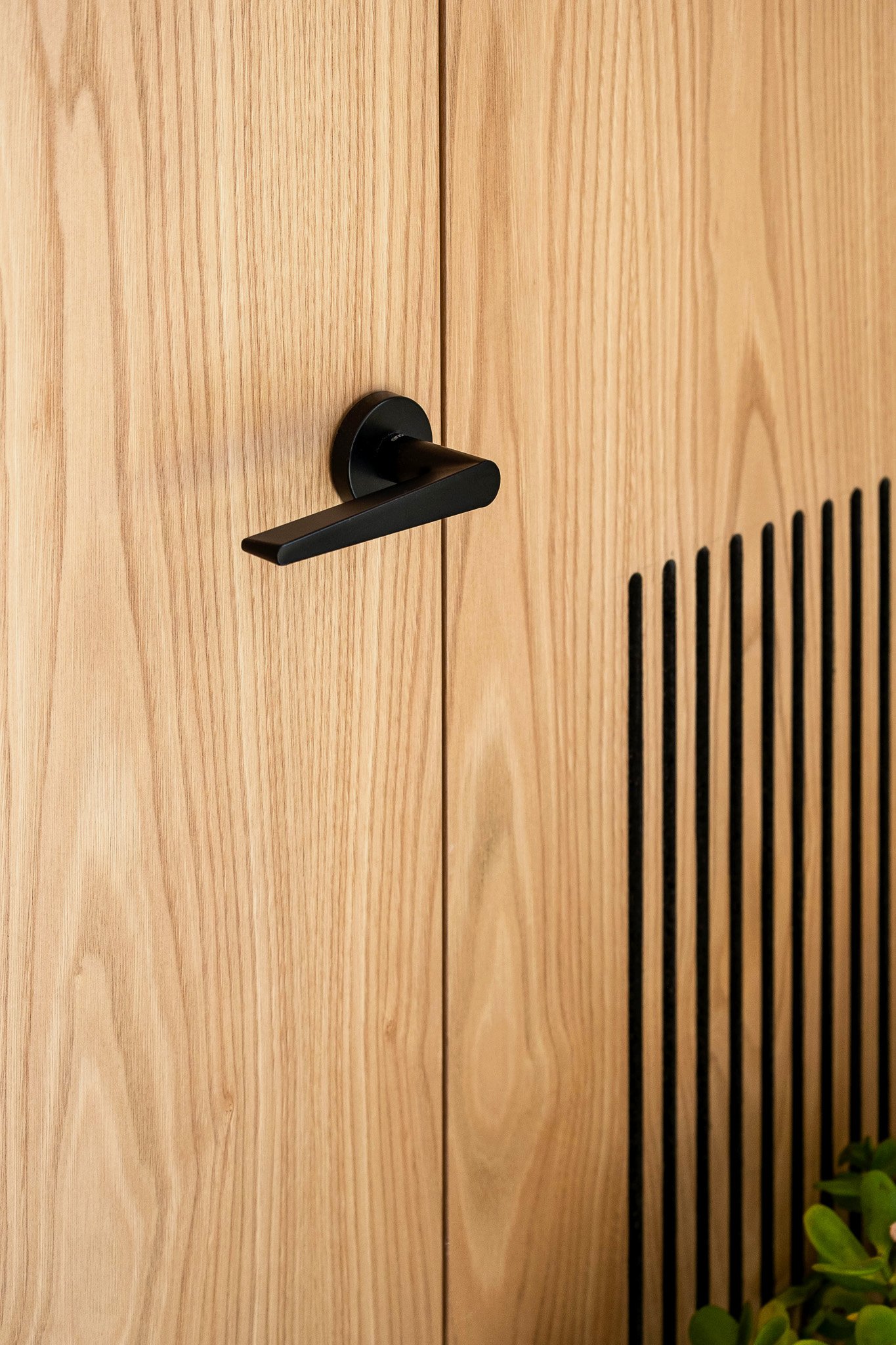 Només accedir al local, tocant a la façana, hi trobem les zones d’atenció al client. A mesura que avancem, col·loquem unes lames de fusta que serveixen de filtre visual i afegim una taula per a reunions més informals, introduint un grau més d’intimitat, sense sacrificar la sensació de fluïdesa i aprofitant al màxim la llum natural. A la zona del final, en canvi, hi construïm un petit despatx amb possibilitat de tancar-se completament per a reunions més confidencials, però mantenint una relació visual directa amb la resta de l’agència.